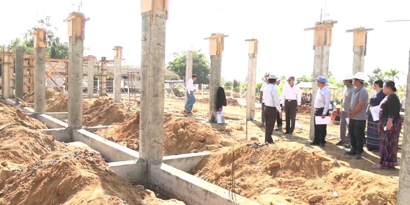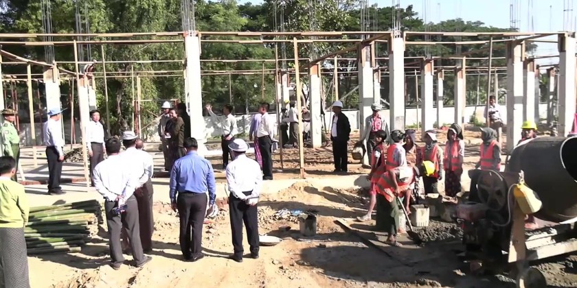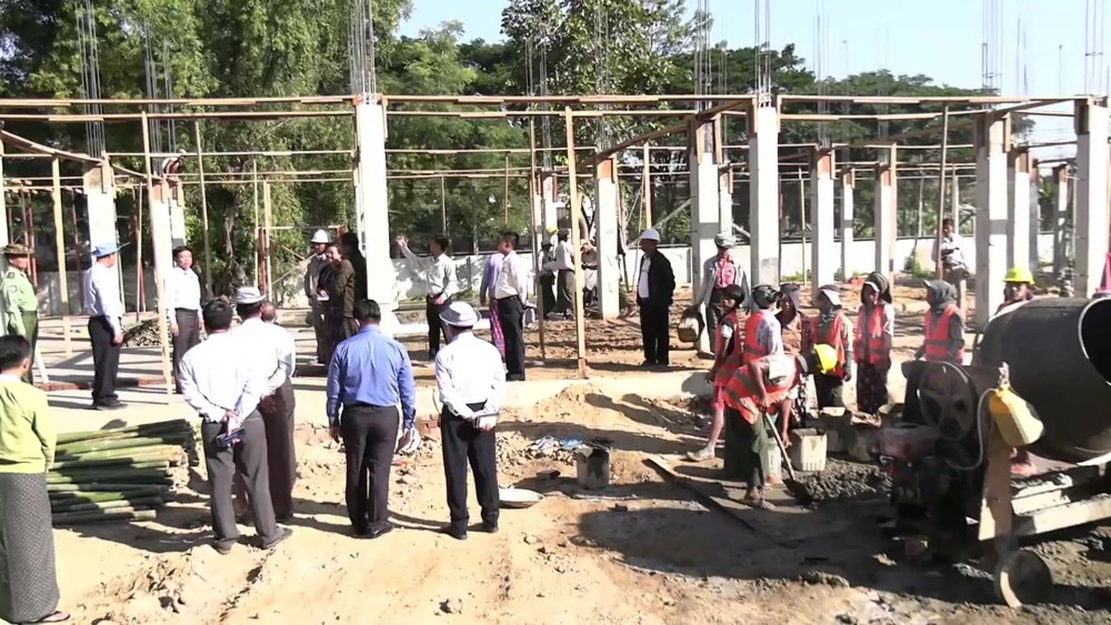 First, the Chairman visited the Naypyidaw Council office compound and inspected the construction progress of a two-story reinforced concrete bachelor quarter (222 ft long× 44 ft wide) and a six-apartment, four-story reinforced concrete staff housing. After reviewing the progress, he instructed the responsible officials to address any necessary adjustments.