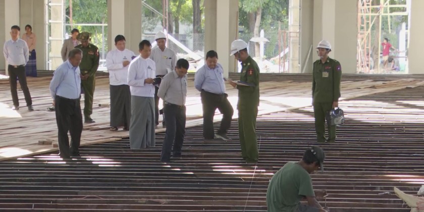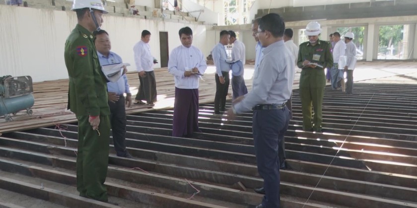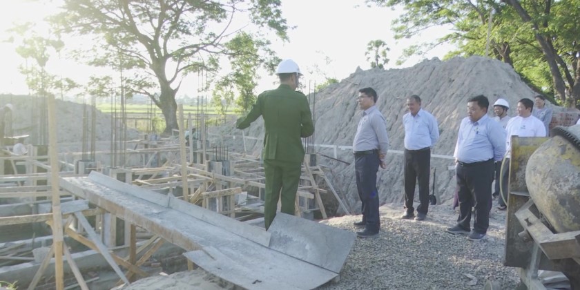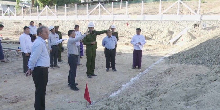 Union Minister for Agriculture, Livestock and Irrigation U Min Naung, accompanied by Deputy Minister U Bo Bo Kyaw and officials, inspected the work site of the Students' Recreation Center project (162 feet in length x 90 feet in width) under construction in the Yezin Universities Area in the afternoon of December 9.
