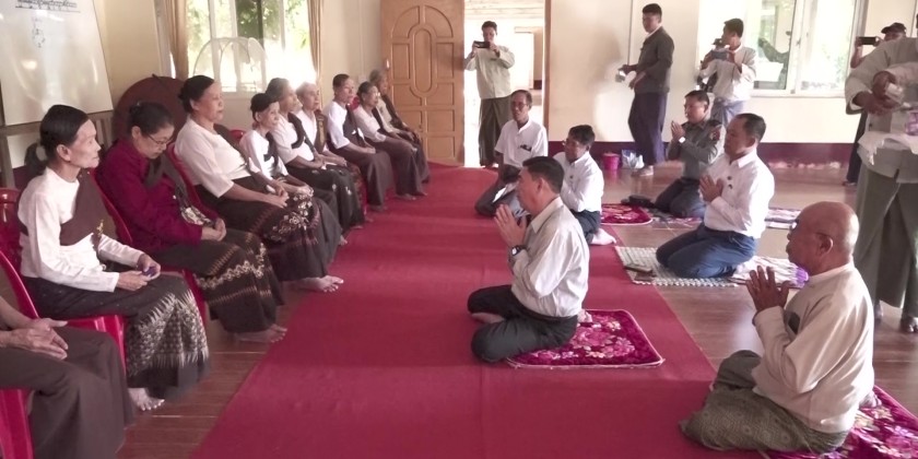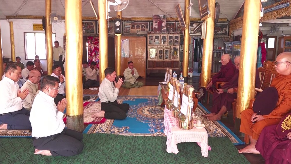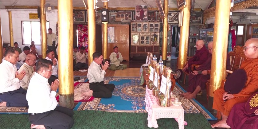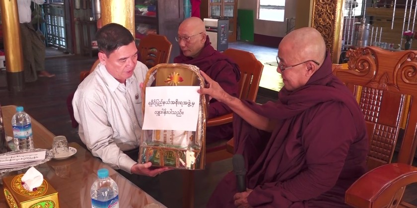 First, the State Chief Minister and officials visited Dhamikarone Monastery in Manaung Township, paid homage to the township's Ovadacariya Sayadaws, received the Five Precepts from the presiding Sayadaw of Dhamikarone Monastery, and offered alms and donation items to the venerable Sayadaws.
