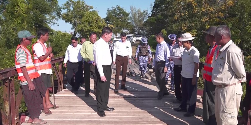 On the morning of December 2, the Chief Minister and officials visited the worksite of the 150-foot (timber-pile) steel-reinforced concrete bridge on the Manaung Island ring road, inspecting construction of the approach roads on both sides and the asphalt-paving works on the bridge deck. They instructed that all works must meet the required standards and be completed on schedule within the designated timeframe, according to reports.