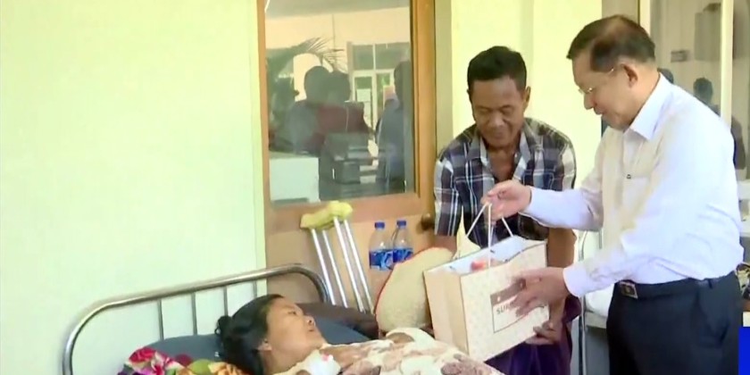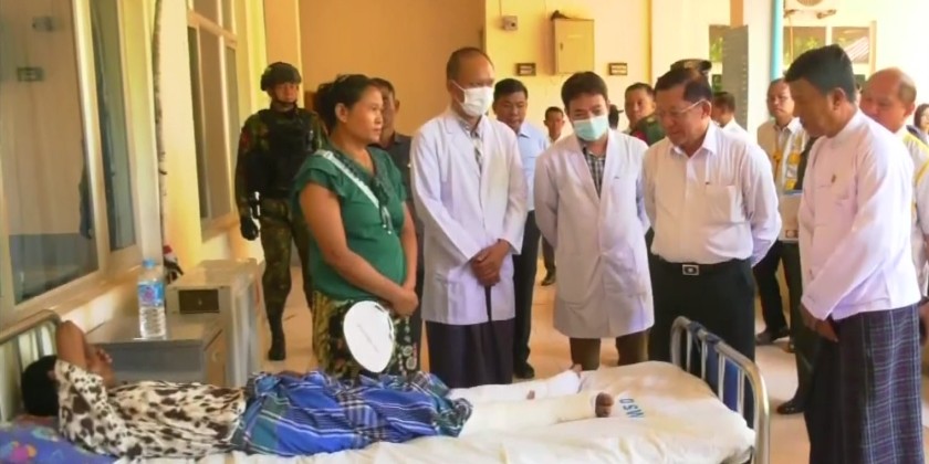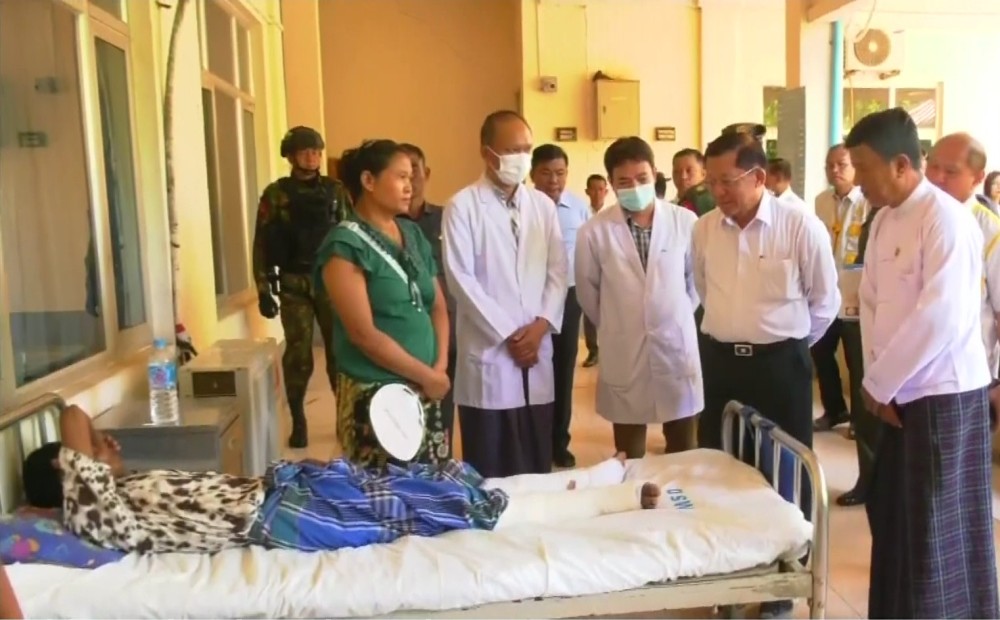 First, the Prime Minister and members arrived at the Kyaukse People’s Hospital, where they observed, the medical treatment being provided to those injured in the earthquake. The Prime Minister spoke words of encouragement to the patients, reviewed the healthcare services being given, and provide cash assistance and foodstuff for the injured. They then inspected the areas of the hospital damaged by the earthquake and provided guidance for necessary repairs.