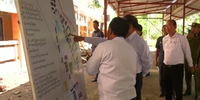 At the temporary briefing hall of Kyaukse Technological University, Pro-Rector of the university, Dr. Khin Maung Chin, presented a report on the damage to the university buildings caused by the earthquake. Following that, the Prime Minister and members visited damaged teaching facilities, site of gymnasium, student dormitories, and staff housing.