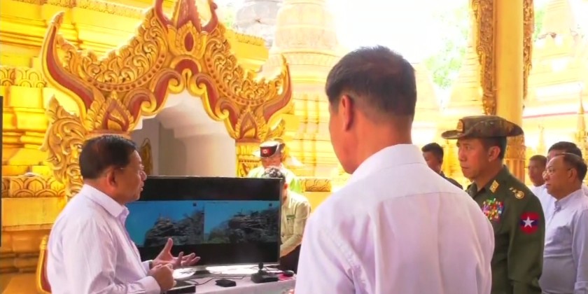 The Prime Minister and members continued their inspection of the Kyauk-Thittar pagoda and, based on the reports from responsible officials, the Prime Minister instructed that drone footage be used to obtain detailed data of the site.