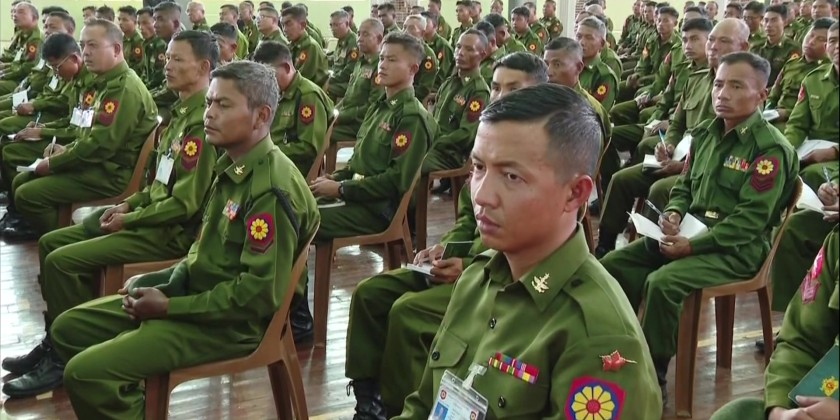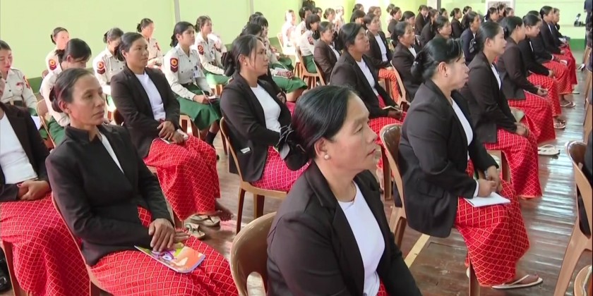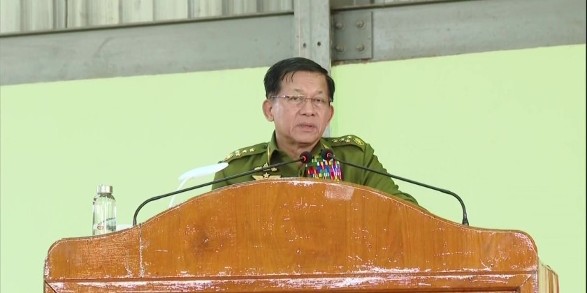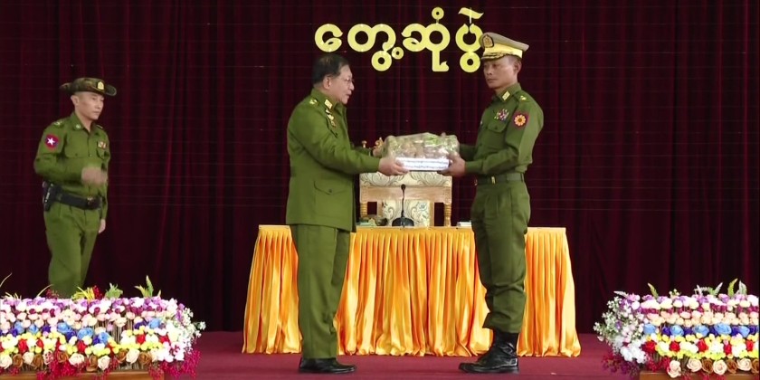 In the afternoon, the Senior General met with officers, ranks, and families of the Kho Lam ခိုလမ် Station at Aung Zeya Hall. During his address, the Senior General stressed that the East-Central Command area is home to a diverse group of ethnic nationalities and is geographically significant for the nation, the primary responsibility of the Tatmadaw is national defense and security.