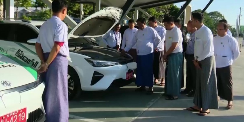 The Vice Chairman of National-level leading committee on the development of electric vehicles and related business, Union Minister for Industry Dr. Charlie Than together with the officials inspected EV Charging Stations in front of Tha Pyay Kone Market and Municipal Guest House in Zabuthiri Township, Nay Pyi Taw Council area in the afternoon on Wednesday.