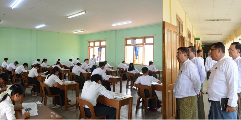 The Union Minister for Education, Dr. Nyunt Pe, accompanied by responsible officials, visited examination centers at No. 3 Basic Education High School in Pobbathiri Township and No. 12 Basic Education High School in Ottarathiri Township in Nay Pyi Taw in the morning on 17th March. The minister observed and encouraged students who were calmly taking the Myanmar language subject exam on the first day of the 2024-2025 academic year matriculation examination.