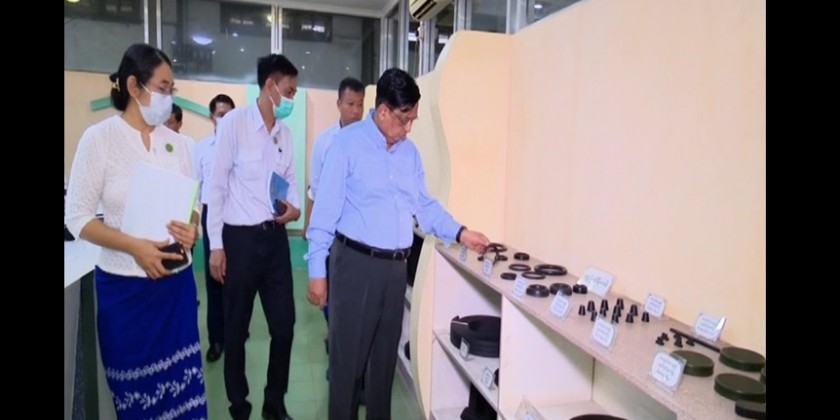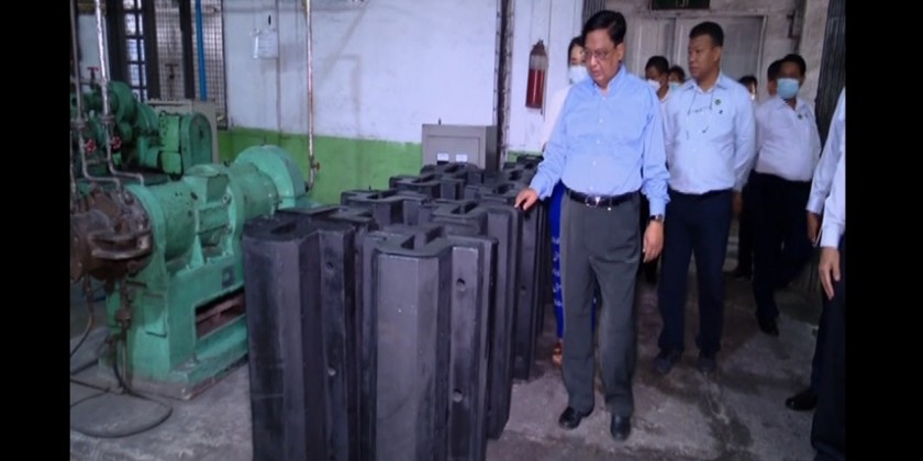 On August 28, the Union Minister continued his inspection trip to the Rubber Products Factory (Thingangyun) in Thingangyun Township and called for efforts for production of new products, updating the technologies and cooperating with relevant ministries before inspecting rubber products production process.