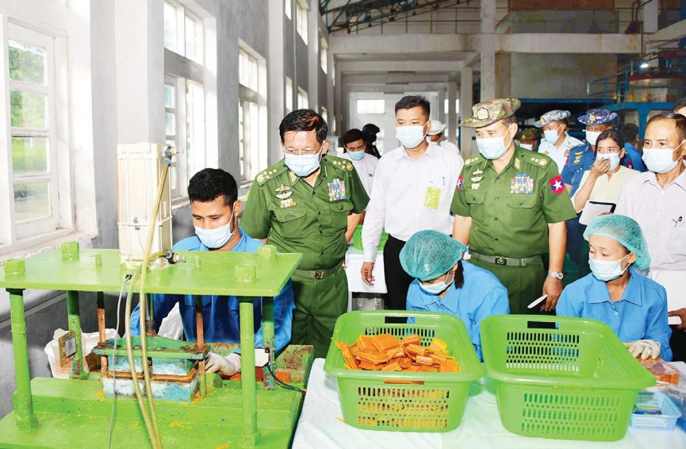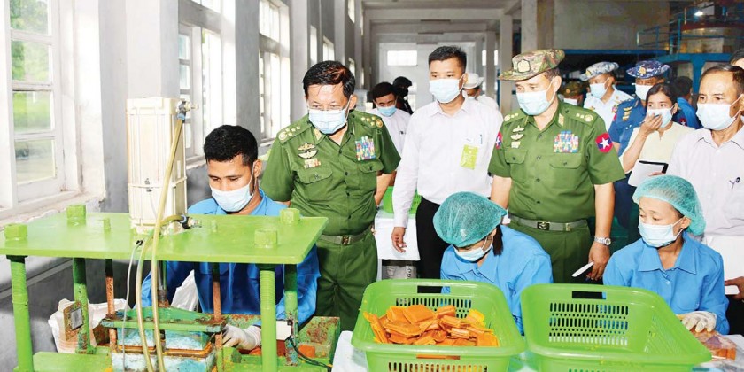 State Administration Council Chairman Commander-in-Chief of Defence Services Senior General Min Aung Hlaing, accompanied by the SAC members, Union Ministers, the Mon State Administration Council Chairman and the Commander of South-East Command, paid a visit to Padonmar Soap Factory (Paung) of the Myanmar Economic Holdings Public Company Limited in Paung Township of Mon State on Tuesday.
