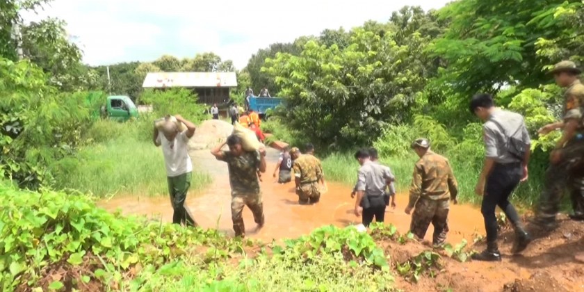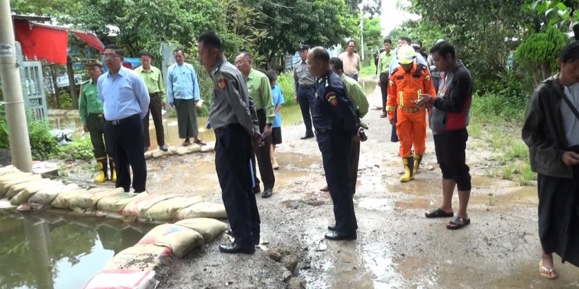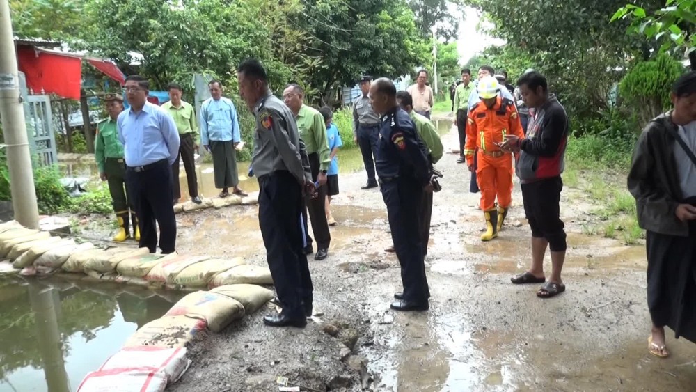 They evaluated the rising water levels and checked the integrity of the embankments designed to prevent flooding. They assessed the efforts of the military, Myanmar Police Force, and fire brigades, as well as local residents, in using sandbags and constructing embankments to prevent further water ingress.