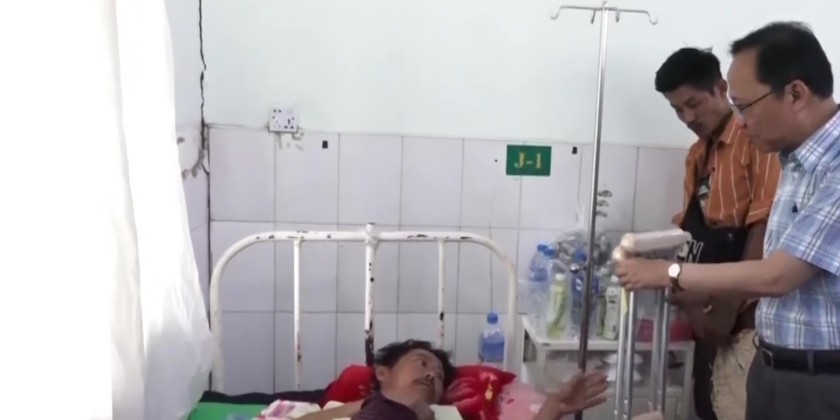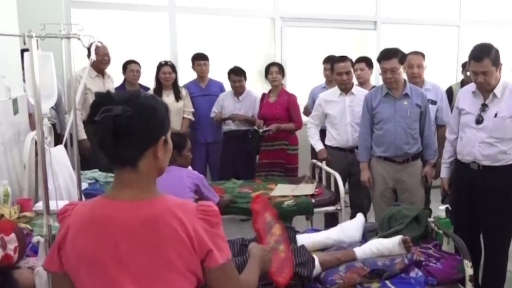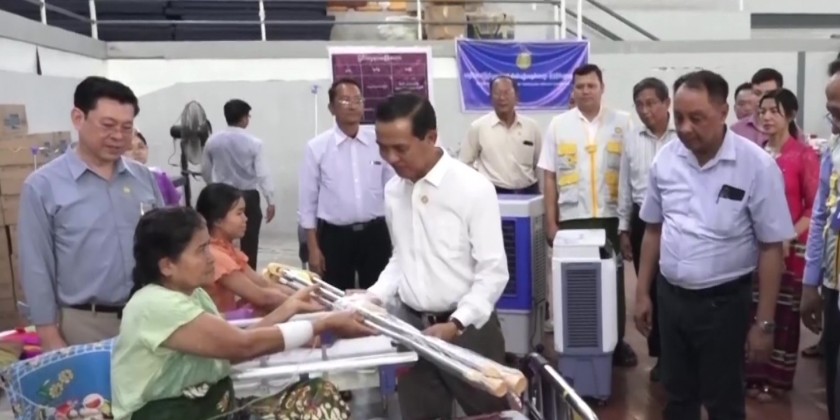 The Union Minister then proceeded to Shwe Kyar Pin Temporary Hospital, where he warmly interacted with patients. He provided crutches, quad canes, and a wheelchair to those with leg, arm, and spinal injuries, including a patient who had both legs amputated due to the earthquake.