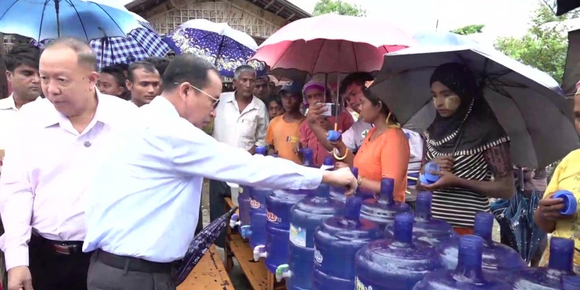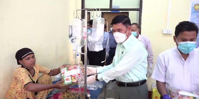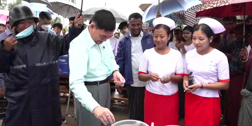 Next, the Chief Minister and party visited Thet-Kal-Pyin IDP camp, oversaw putting Chlorine into the drinking water to prevent commonly occurring health problems such diarrhea, provided chlorine tablets for the people sheltered in the camp, watched the health educating talk and gave necessary instruction to the responsible officials, it’s reported.