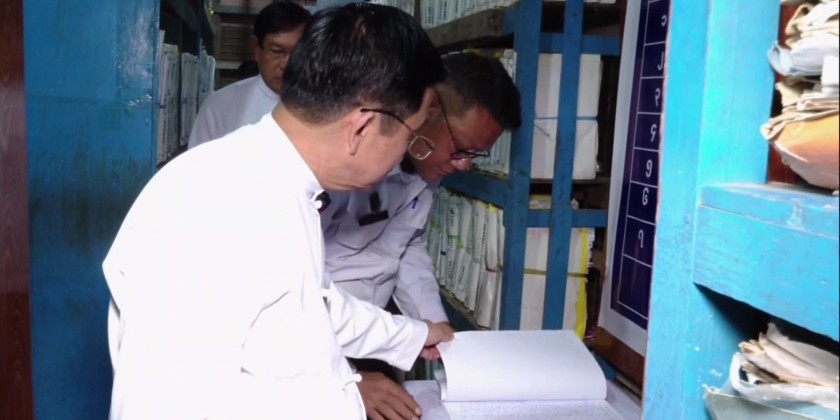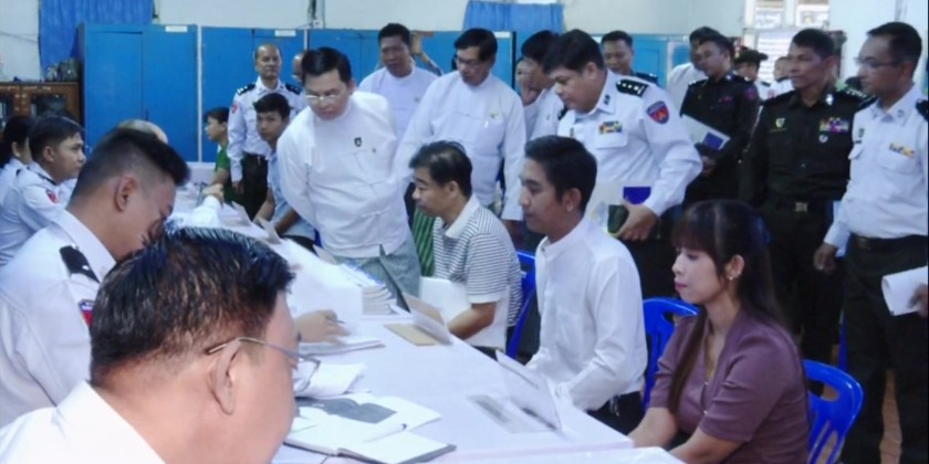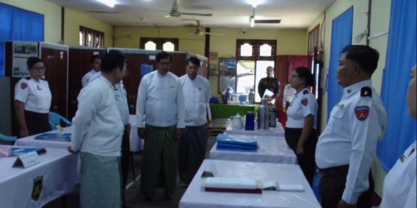 Following this, the Union Minister and the Region Chief Minister inspected the offices within the Township office. They checked the maintenance of office documents and equipment, and the systematic filing of personal records in the registry room. They instructed officials to ensure the security of documents and machinery/equipment and to emphasize efforts so that every eligible voter can possess and present at least one type of identification card to vote. They also coordinated necessary matters based on explanations and presentations by the responsible officials.