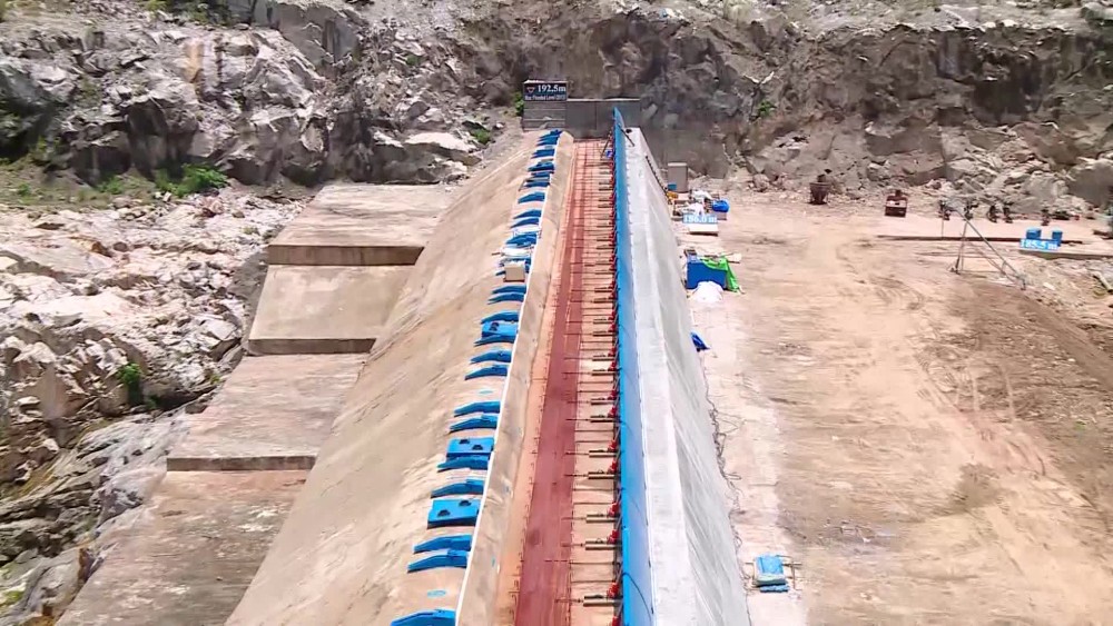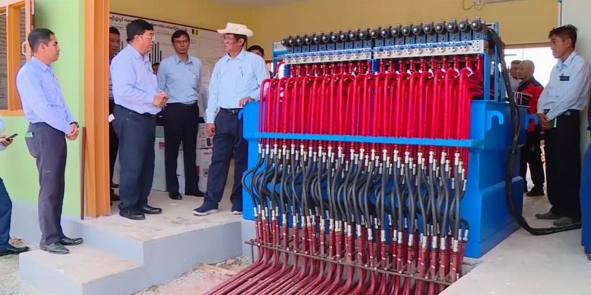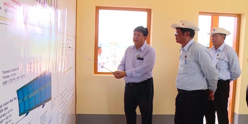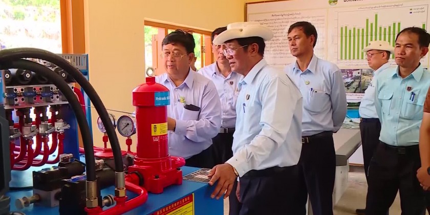 First, the Union Minister and party arrived at the Dant of Paung Laung Hydro-Electric Power Plant and the responsible officials from the Department of Irrigation and Water Management clarified the 80% completion of installing Hydraulic Elevator Dam (HED) at the spillway of Paung Laung Dam and action plans to complete fully within the scheduled time.