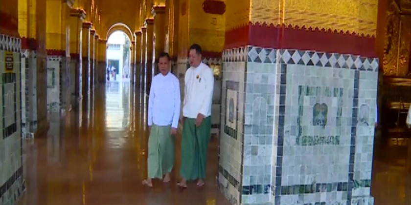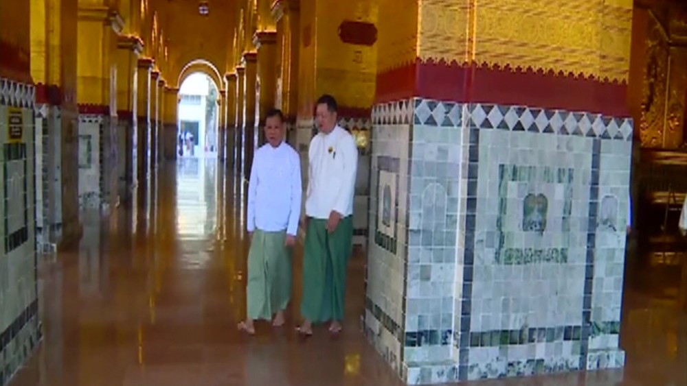 Member of the State Administration Council U Maung Ko, Union Minister for Information U Maung Maung Ohn and Mandalay Region Chief Minister U Myo Aung inspected upgrading of the Repository of Buddha scriptures Museum of Maha Muni Buddha Image in Mandalay on Monday and met Rectors, Pro-rectors, region/district/township education officers, high school and middle school principals and presented commemorative books and handbags.