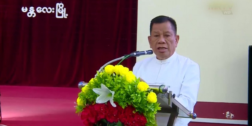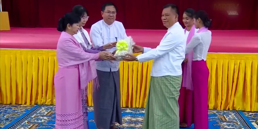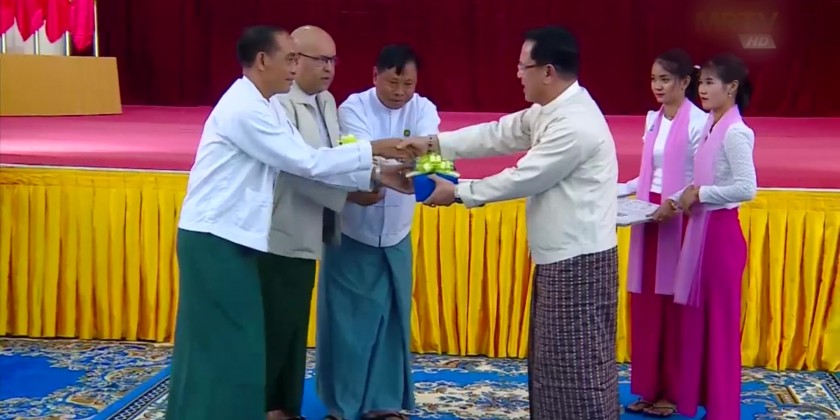 First, the SAC member U Maung Ko addressed the opening speech.Next, the Union Minister U Maung Maung Ohn and Chief Minister U Myo Aung gave the marks.Then, the SAC member U Maung Ko, Union Minister U Maung Maung Ohn and the Region Chief Minister U Myo Aung presented memorable gifts to the teachers.