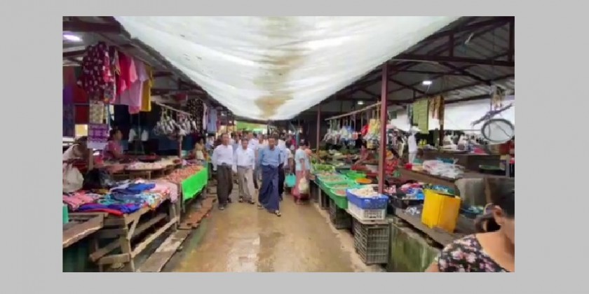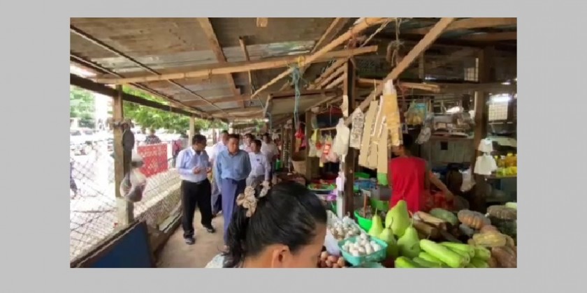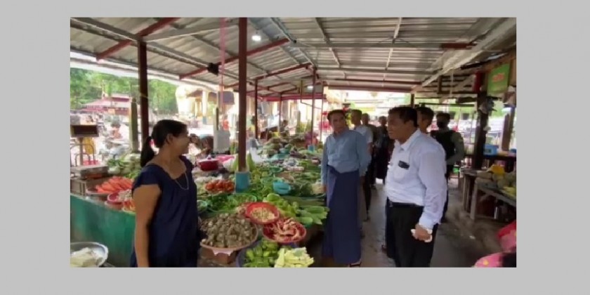 At the Shwe Thar lyaung Market, the Chief Minister observed the retail selling of basic foodstuff and coordinated to sell the goods from the farmers and breeders who are selling in the Bago Myoma Market.