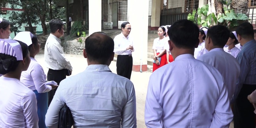 The Union Minister first visited the Bago Midwifery Training School. During his inspection of the campus, he noted that the current school is situated on the moat and walls of the ancient Hanthawaddy city. Consequently, he provided instructions regarding the planned relocation of the school to Kali Village, Bago. His guidance focused on building construction plans at the new site and necessary preparations for the transition.