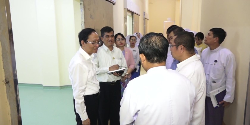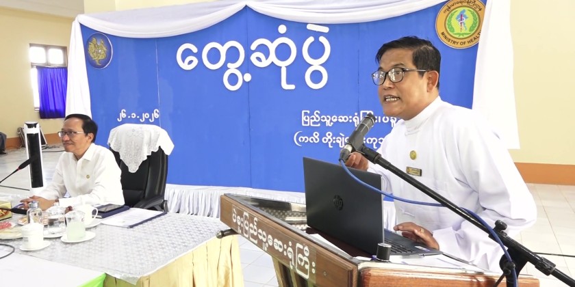 The Union Minister and officials then proceeded to the new 6-story treatment wing (Kali) of the Bago General Hospital. There, he met with Bago Region Health Department Head Dr. Zaw Min Tun, Medical Superintendent Dr. Zaw Lwin, Hospital management members, specialists, and matrons, officials from the Food and Drug Administration (FDA) and the Department of Traditional Medicine.