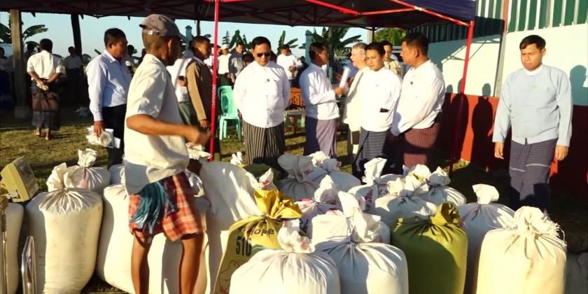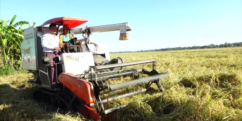 Then, the Union Minister coordinated requirements reported by the farmers for the regional development.Next, the Union Minister and party observed the harvesting one acre model plot of Hsin-Thukha monsoon paddy (120 days) owned by farmer DawThet which is experimental plantation using Russian natural fertilizer and cooperated with Russian Federation Roscongress Investments Fund.