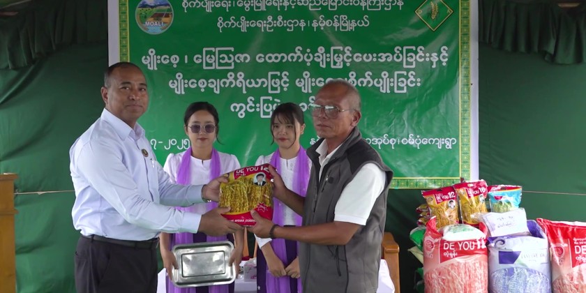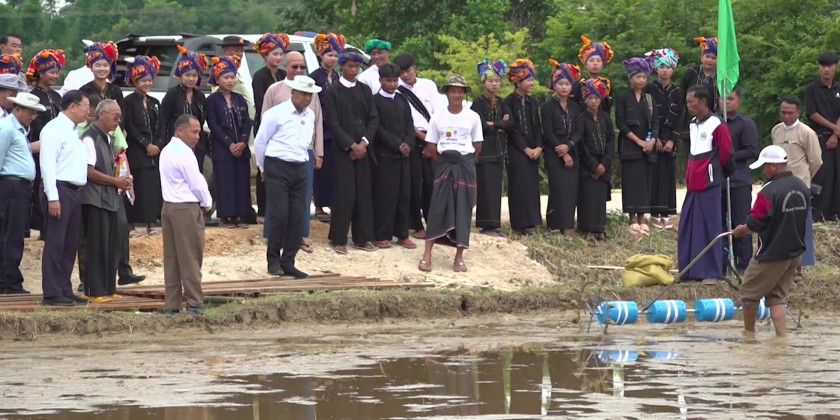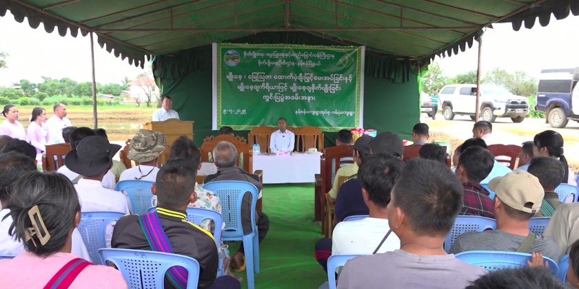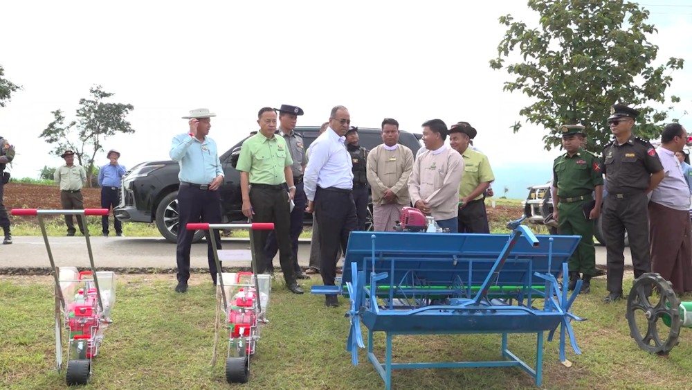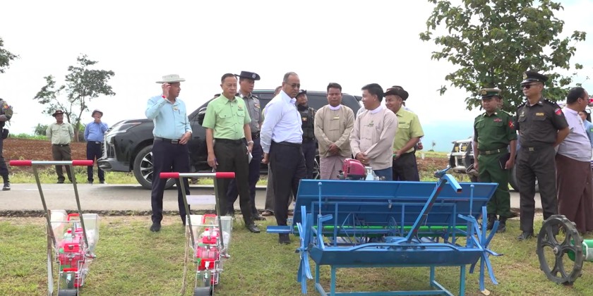 After that, the Chief Minister and officials went to Wan Pon Village in Namsang Township, where they attended a field demonstration event organized by the Agriculture Department. During the event, seeds and fertilizers were distributed, and the use of seeder was demonstrated. The Chief Minister delivered a speech and presented seeds and fertilizers to the farmers.