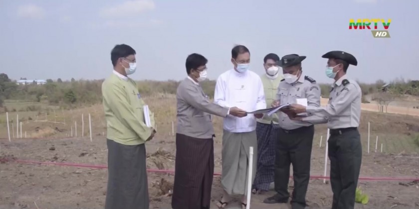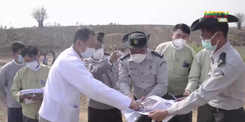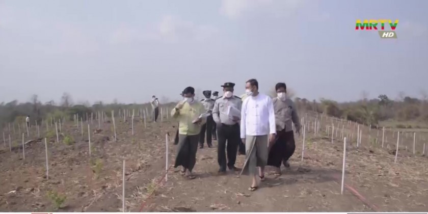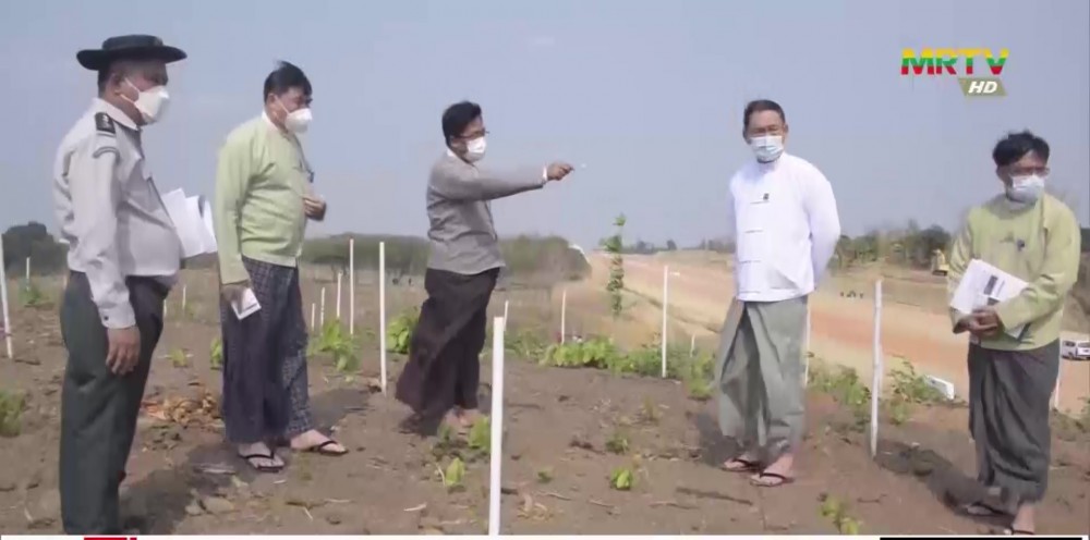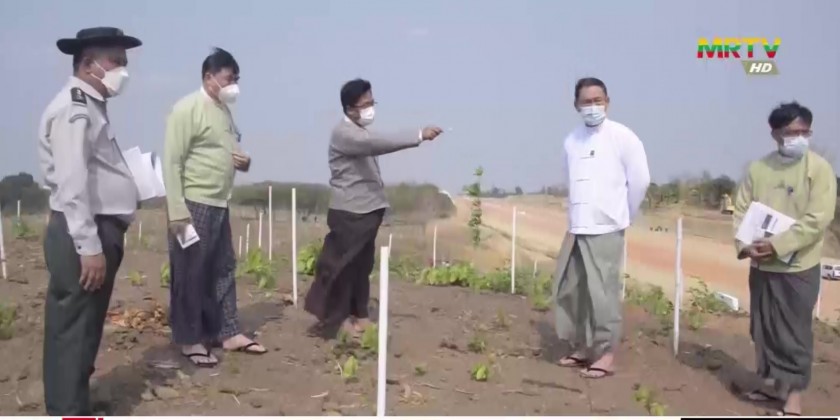 The Union Minister for Natural Resources and Environmental Conservation U Khin Maung Yi inspected the land plot (6.8 acres) to be planted trees with 2022 pre-monsoon season public campaign at land plot lot (13) in Yan Aung Myay forest reserve, Lewe Township in the evening on 24th March.