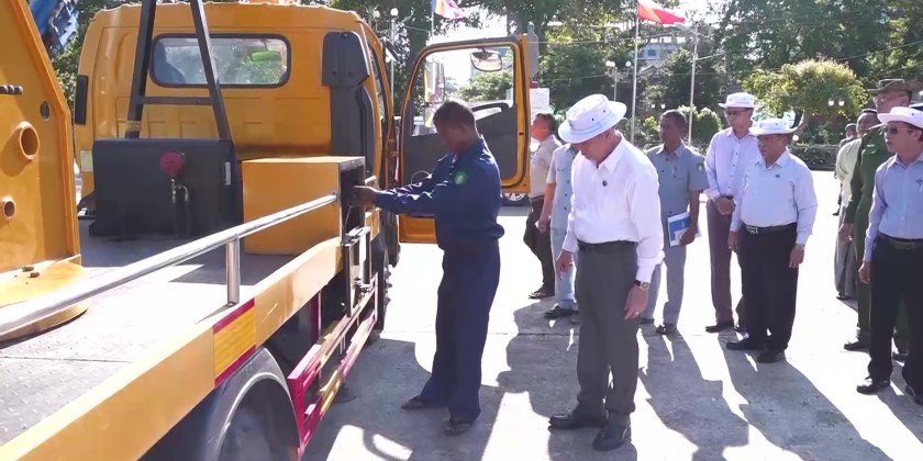 First, the Rakhine State Chief Minister and officials went to observe the test driving of water tanker trucks and crane trucks purchased and supplied using the permitted state budget funds from the Rakhine State Government at the U Ottama Park in Sittwe. The State Minister for Natural Resources and responsible officials accompanied them and provided explanations.