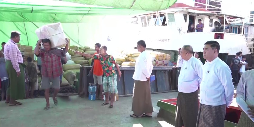 In the morning of October 21, Rakhine State Chief Minister U Htein Lin went to the multi-purpose jetty in Sittwe. Following the guidance of the National Natural Disaster Management Committee, and under the organization and supervision of the Rakhine State Government and the Yangon Region Government, he inspected the arrival of the MV Aung Yadana Thiri (1) and MV Ye Tun Aung (3) vessels from Yangon, which were carrying rice, other basic food commodities, and consumer goods, and observed the loading and unloading operations. He also coordinated necessary measures with the responsible officials.