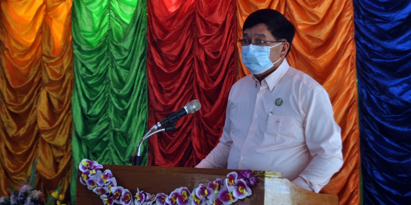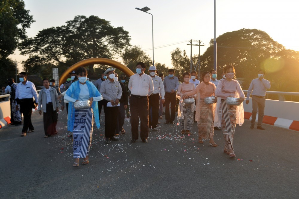 Then, the chief minister gave an opening remark at the opening ceremony of KyayNiChaung Bridge near MoeGaung Village, AungLan Township in the gesture of hailing and honoring the 75th Diamond Jubilee Union Day and the chief minister, region minister for transportation, region minister for ethnic affairs and region Advocate General opened the bridge by cutting the ceremonial ribbon, sprinkled with scented water to the Bridge stone inscription and inspected the bridge by walking on it together with the guests.