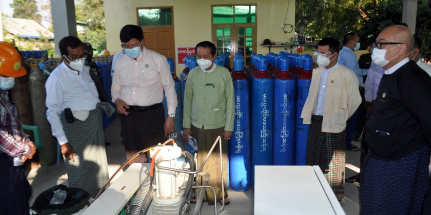 First, the Chief Minister and party inspected the Ayeyawady River Crossing Electricity Tower and connecting cables, opened Oxygen Plant donated by the Magway Region Government in the People’s Hospital compound in Set Yon ward by pressing the button, handed over documents related with the oxygen plant, met with the departmental officials, hospital staffs, volunteers and ward administrators and gave a remark.