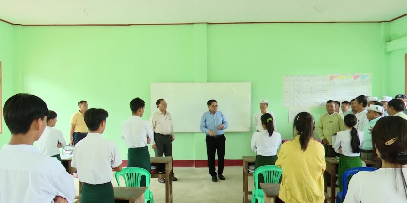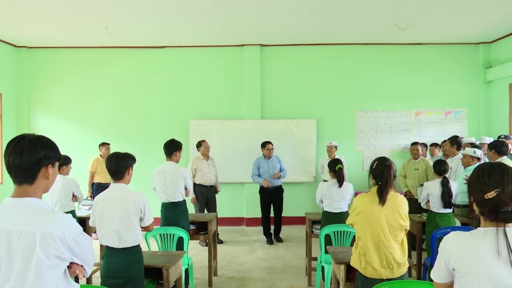 At the school, the Chief Minister viewed the teaching and studying at the school, cordially greeted the students, coordinated requirements of class chairs and textbooks by flight and provided 3 million Kyats of cash assistance for the teachers.