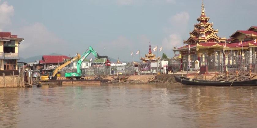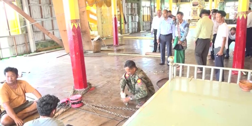 The Chief Minister and officials inspected the timbers and cement bags for the construction of houses, at the motorboat jetty in the Inlay hotel zone intended for rehabilitation purposes. They also observed the completed repair works at the Kay Lar ကေလာ Monastery, which had been damaged by the earthquake, using chain blocks and backholes.