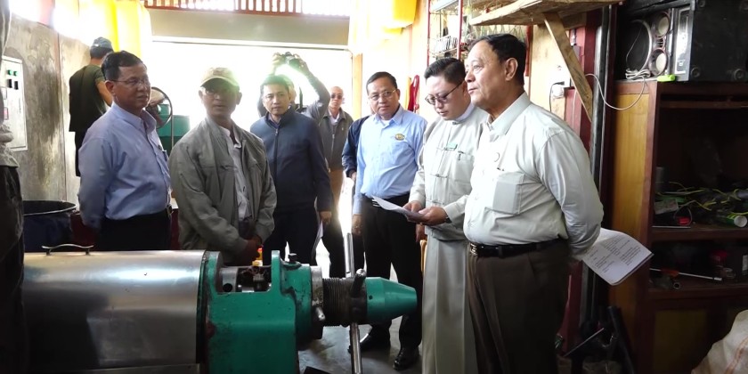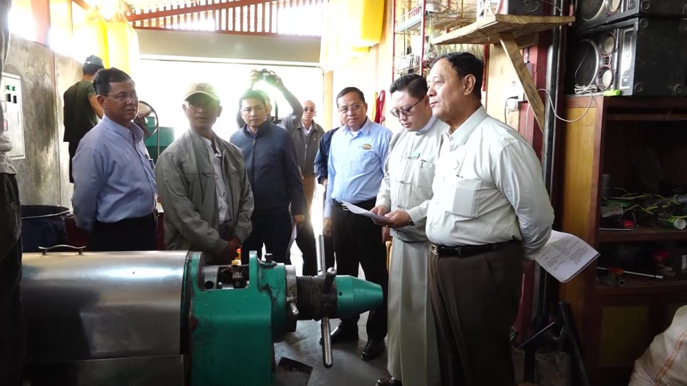 Initially, the Union Minister and officials visited Kyone Village in Pindaya Township, Shan State (South). They inspected the operations of the oil mill run by U Sein Than, a member of the Yaung Chi Oo Agriculture and General Economy Cooperative Society.