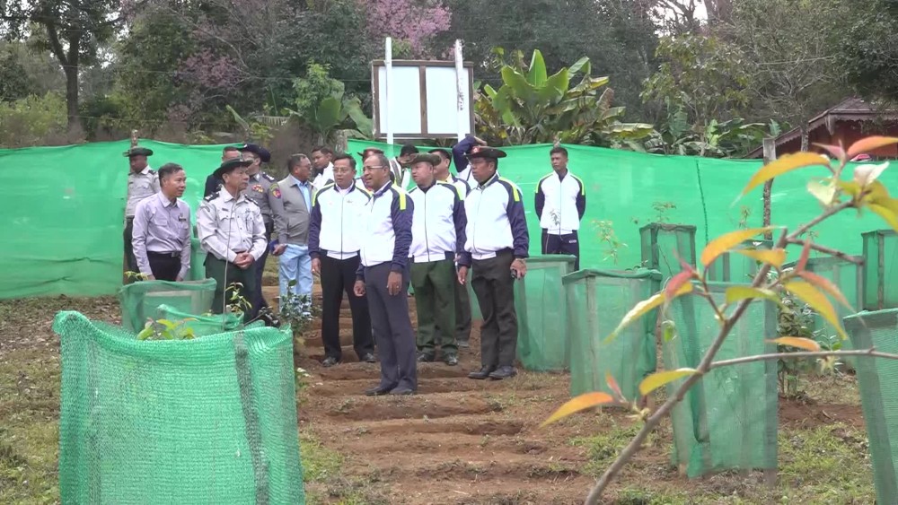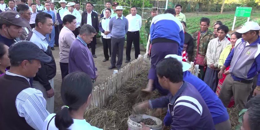 They also visited Kyaileik Village in Kengtung Township, inspecting a pig farming facility in the East Mekhong village, where they observed the farm and distributed medicines for pigs to the owner.Later, the Chief Minister and officials visited a farmer training camp in Naungkon village, where they observed practical demonstrations of the use of EM-Bokashi and super- Bokashi fertilizers for crops. They also distributed seeds and fertilizer to the farmers and toured cultivated garden in the area.