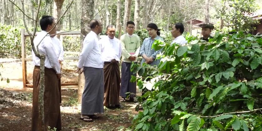 Next, chief Minister and officials visited Pwint Kaung and Khin Nwet Yi Coffee farm in MaGyiGone Village in Yatsauk Township, the farm in-charge clarified the cultivation of coffee, mango and rubber and the Chief Minister and officials looked round in the coffee farm. The coffee from this farm is only made as domestic distribution.
