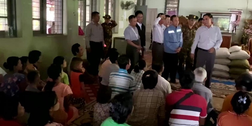 Then, the Chief Minister and party arrived at Pyinnyar Mon monastery where the flood relief camp is opened, greeted and gave words of encouragement to the flood victims and provided rice, cooking oil, eggs, dry noodle and other kitchen items and cash for rice provided by the Natural Disaster Management Department.