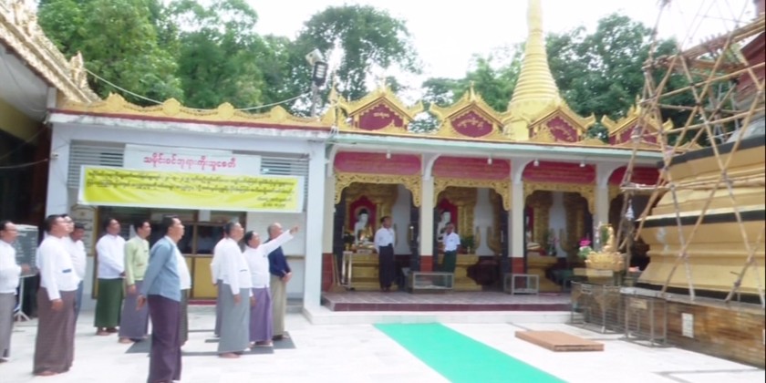 First, the Union Minister and officials arrived at the historically significant Thathana Alin Yaung Hlay Khwin Taung Taw Koemoke Pyan Padamya Kat Kyaw Pagoda in Kyae Taung village tract, Zeyarthiri Township, Nay Pyi Taw, which was affected by the earthquake.