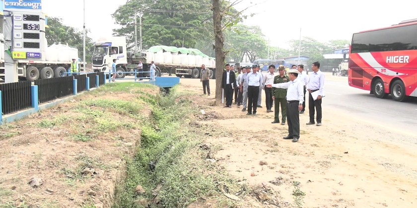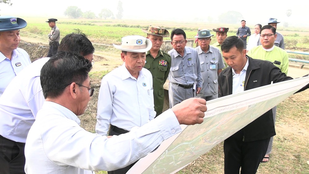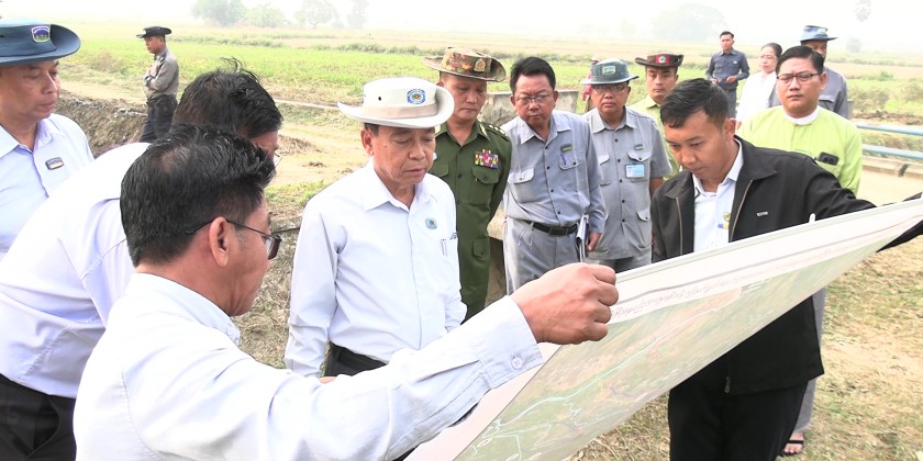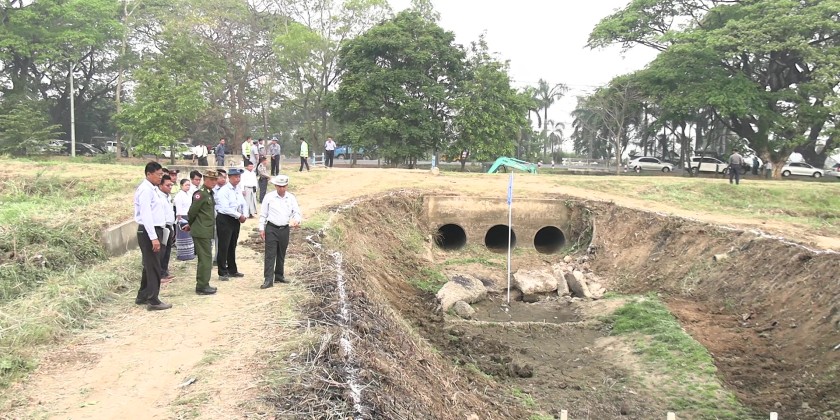 He conducted an inspection tour of the ongoing excavation of drainage ditches along both sides of the road, from the Pin Laung Junction to Kyaukchet Village, aimed at reducing flooding and improving water flow. He instructed responsible officials to ensure the ditches are kept clear of debris for efficient drainage, to excavate the drains systematically according to specified dimensions, to properly measure and set the levels of the drain floors, to systematically construct box culverts, and to prevent blockages caused by garbage.