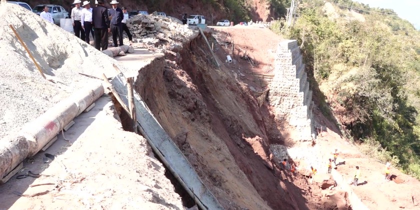 During the field inspection, Shan State Chief Minister U Aung Aung, State Minister for Transport U Nay Win Aung, and the Chairman and responsible officials of the Kalaw District Administrative and Management Committee examined various sites. They inspected the repair work on a collapsed retaining wall due to stream erosion, the ongoing repair using Asphalt Concrete and the reconstruction work on sections where landslides occurred due to natural disasters. A responsible person explained the status of the ongoing works, and the State Chief Minister gave instructions regarding workplace safety and timely completion within the specified period.