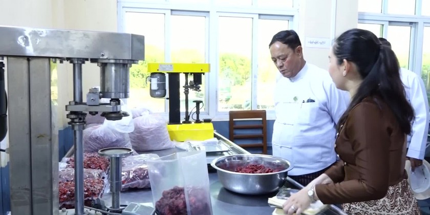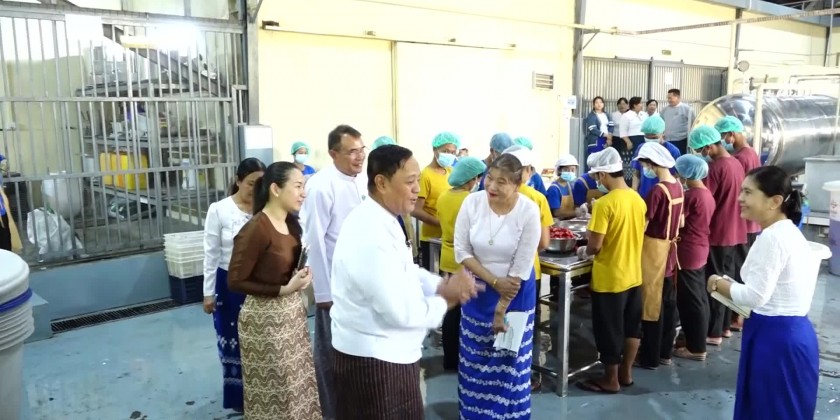 Union Minister for Cooperatives and Rural Development U Hla Moe accompanied by the Director General U Thein Toe of the Department of Small-Scale Industries and officials concerned inspected foodstuff processing factory of Sky Fruit Food Industry Co.,Ltd in Zawana Ward of Ottarathiri Township in Nay Pyi Taw Council Area in the afternoon on Wednesday in order to promote the socio-economic life of the rural farmers, locally produced fruits to be produced as advanced Value-added products and fulfill the work requirements.