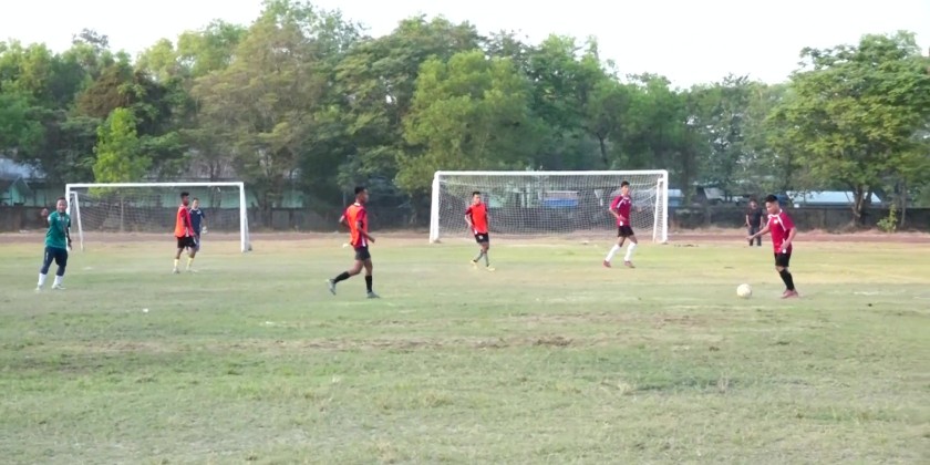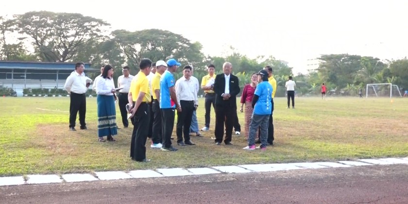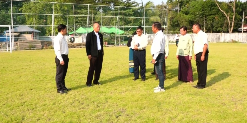 Subsequently, the Union Minister and officials proceeded to Myathida Sports Ground in South Okkalapa Township, where they inspected the progress of the football field upgrading works, the construction of a indoor stadium measuring 200 feet in length and 150 feet in width with a seating capacity of 2,000, the construction of Myathida football field and the phased completion status of the Myathida indoor stadium (200 feet × 150 feet).