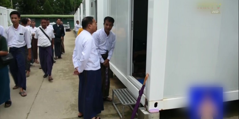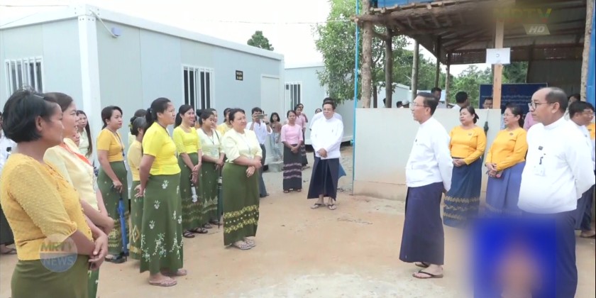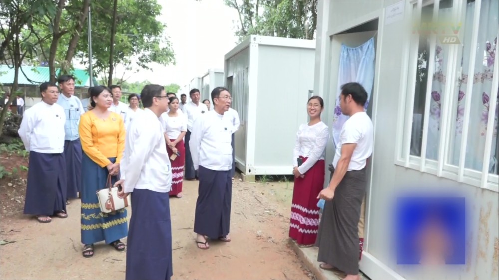 Deputy Prime Minister and Union Minister for Planning and Finance, U Win Shein, accompanied by Deputy Ministers Daw Than Than Lwin and U Min Htut Oo, and other departmental officials, visited the temporary Modular Houses constructed by the Ministry in the evening on July 24 and met with and encouraged the staff residing there.