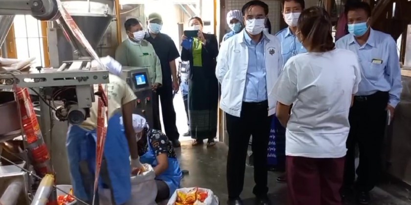 At the seeds purifying factory in Paungde Township, the chief minister gave instructions in responding to the clarifications of the responsible officials regarding with keeping stock of rice, black bean and mung bean seeds and inspected plantation of Yayzin hybrid strain of winter sunflower.