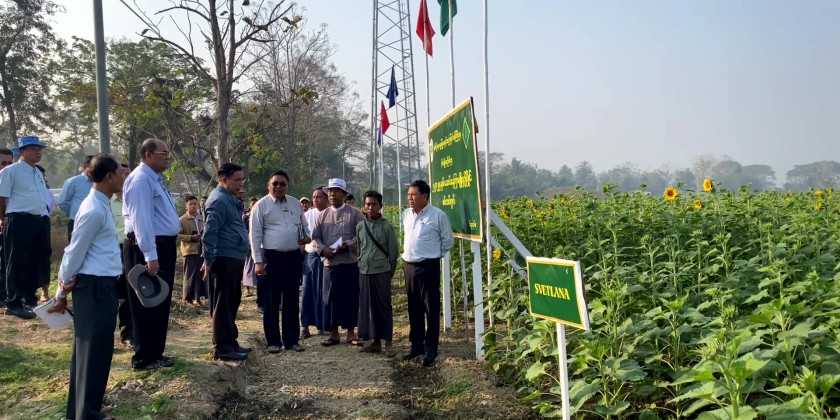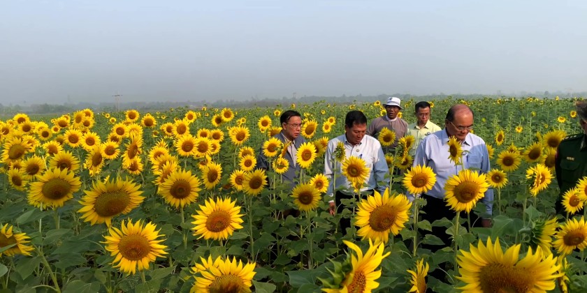 First, the Chief Minister inspected the 2024-2025 winter sunflower seed comparable  experimental plot in Pyay Township, Ngar Ywar Village Tract, and instructed to systematically record the flower size, seed germination rate, plant age, seed recovery, and yield of each sunflower variety, to invite local sunflower farmers to the comparable  experimental plot to educate them, and to also grow crops that can be grown alongside the sunflower.