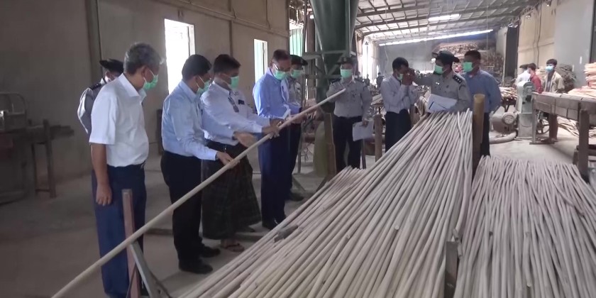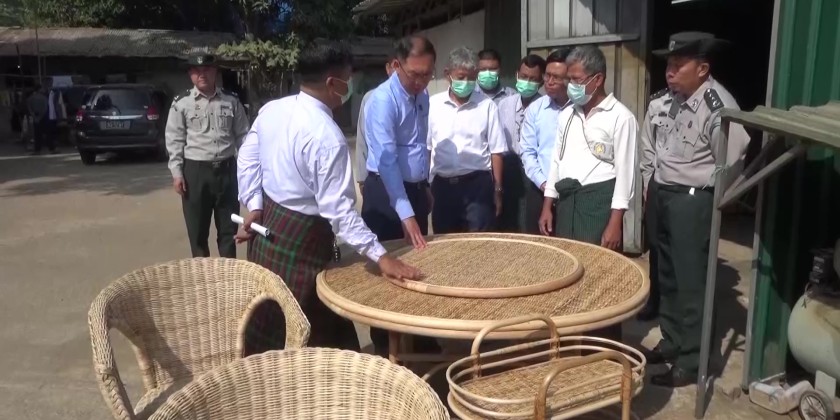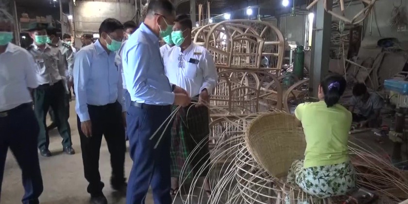 Union Minister for Natural Resources and Environmental Conservation U Khin Maung Yi visited Shwe Pin Lae Rattan Ware Factory in Pale Myothit of Yangon Region on Friday. They oversaw the operation process of the factory, and heard reports on the yearly production and export condition.