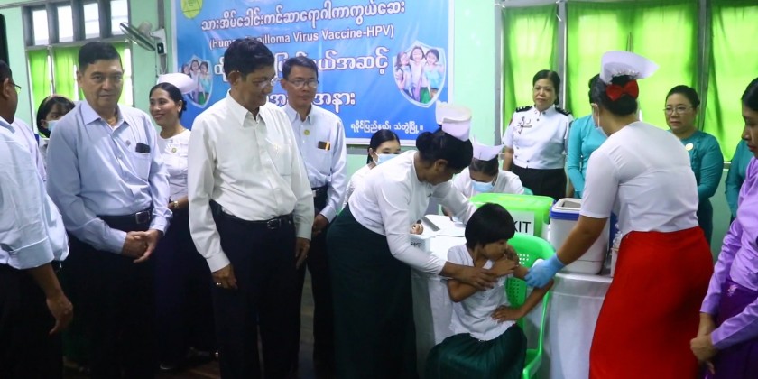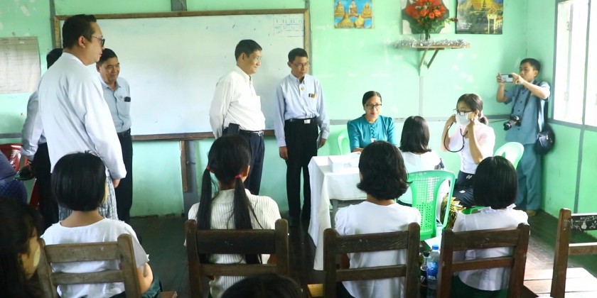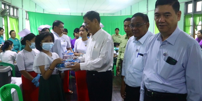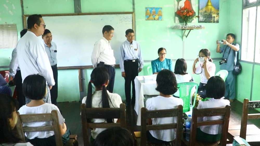 On arrival at the Thadwe Basic Education High School (Myoma), the SAC member and party cordially greeted faculty members and viewed around Human papillomavirus (HPV) vaccination to the female students by the Health Department in the school and presented teaching aid and food.