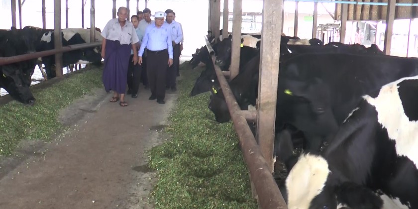 During the inspection, he met with livestock entrepreneurs and stressed to cooperate with local farmers for expanding their businesses from manageable scale to commercial one. Likewise, the Deputy Minister visited the cattle farm in NyaungPinTha Village of Meiktila Township where he observed the thriving of grass plantations for animal feed, cattle farming, and distribution of dairy products.