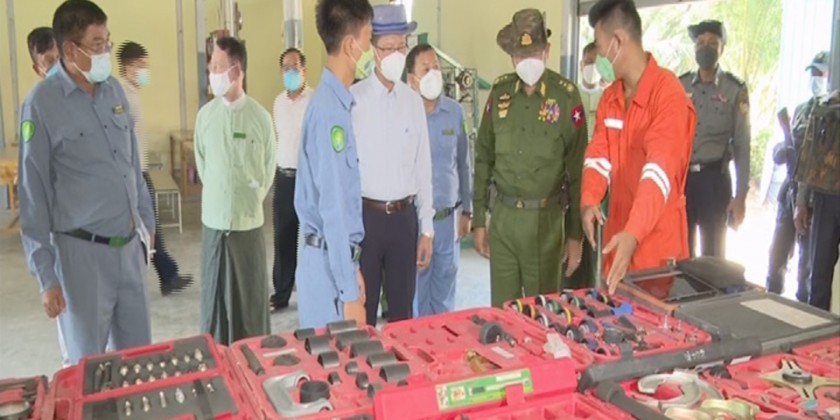 On 27th November, the Union Minister and party arrived at the mechanical training school for the youth of national races and cottage vocational training school for women in Laputta and inspected the trainings of motor vehicle engine repairing, electrical power, welding, carpenter, masonry, steel fixing, hand phone repairing, motor sewing machine and coordinated necessaries.