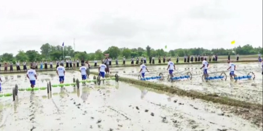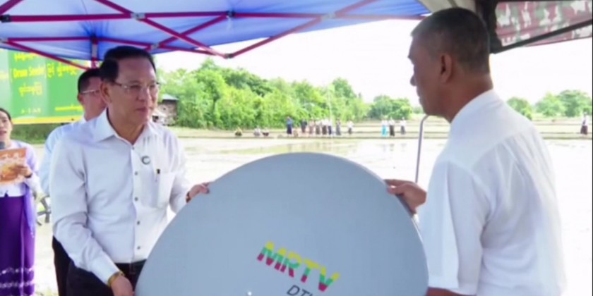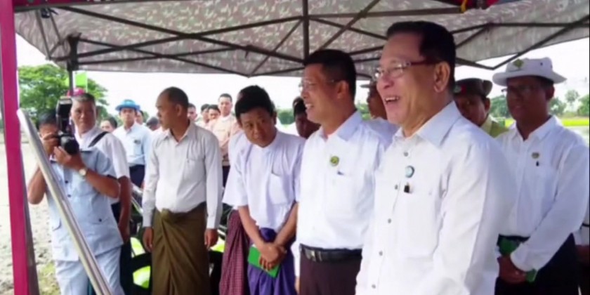 Vice Chairman of the Work Committee on the Development of a Resilient and Strong Social Community Union Minister for Information U Maung Maung Ohn and Chief Minister for Ayeyawady Region U Tin Maung Win on Saturday visited the Knowledge Center in Sarmalauk Village of Nyaungdon Township. There, they viewed the demonstration of seedling method using the Drum Seeder. They also presented the drum seeders and MRTV DTH sets to the farmers from five villages.