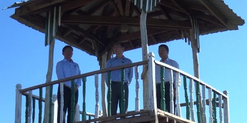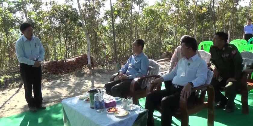 In the afternoon on the same day, the Union Minister and party proceeded to SinMa forest reserve in NgaPuTaw Township and inspected round Manjansha plantation. Then, the Union Minister coordinated the needs upon the reports on tree plantation presented by relevant officials and viewed around the thriving of commercial iron wood plantation.