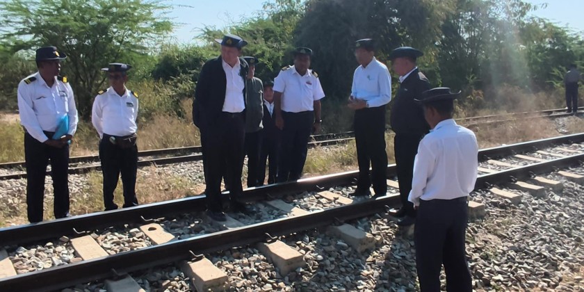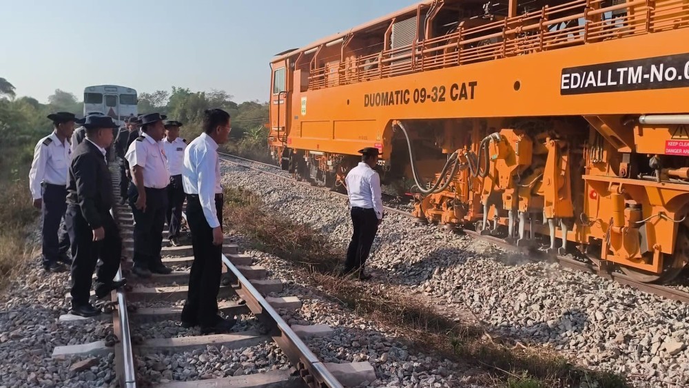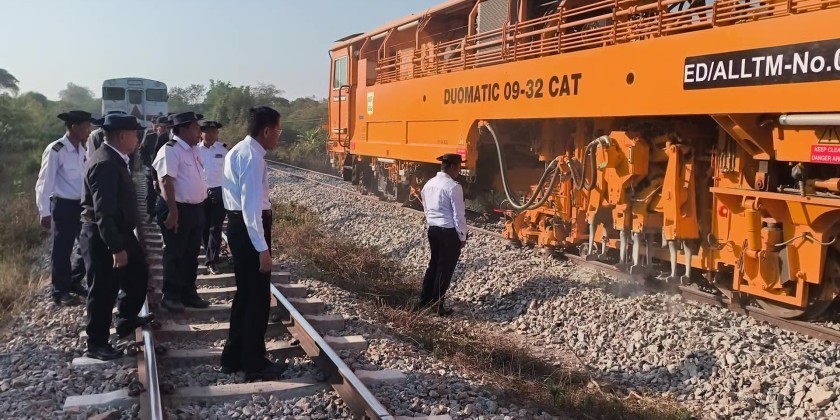 On February 9, the Deputy Minister traveled on an RBE train from Nay Pyi Taw Central Station and inspected the progress of renovation work to increase speeds on the Nay Pyi Taw - Thazi - Thedaw - Mandalay railway line. He observed the process of systematically filling track ballast to the specified standard between Tatkone and Magyi-pin stations, and the ballast packing work being carried out using not only hand tamping machines but also an Automatic Leveling, Lining & Tamping Machine (ALLTM) and provided necessary instructions.
